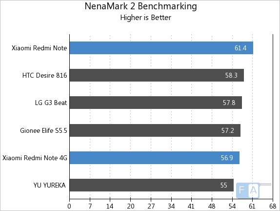 Next up, we had the GPU of the Redmi Note 4G sweating it out. The NenaMark 2 benchmarking application gave us a conclusive evidence of which of the two – Adreno 305 or Mali 450 MP4 GPU is superior.